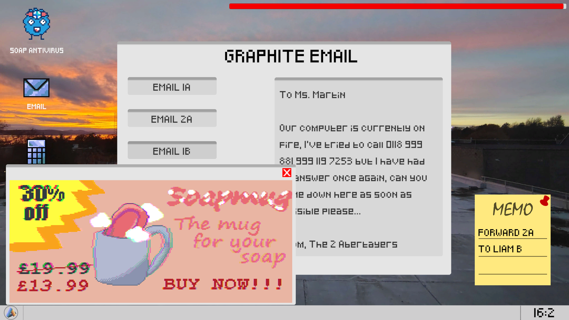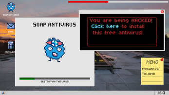 You play as an idiotic college system administrator who downloads a dodgy file from an email they are sent. A hacker enters the system and you must stop them from gaining full control while also completing your tasks so you don't get fired.